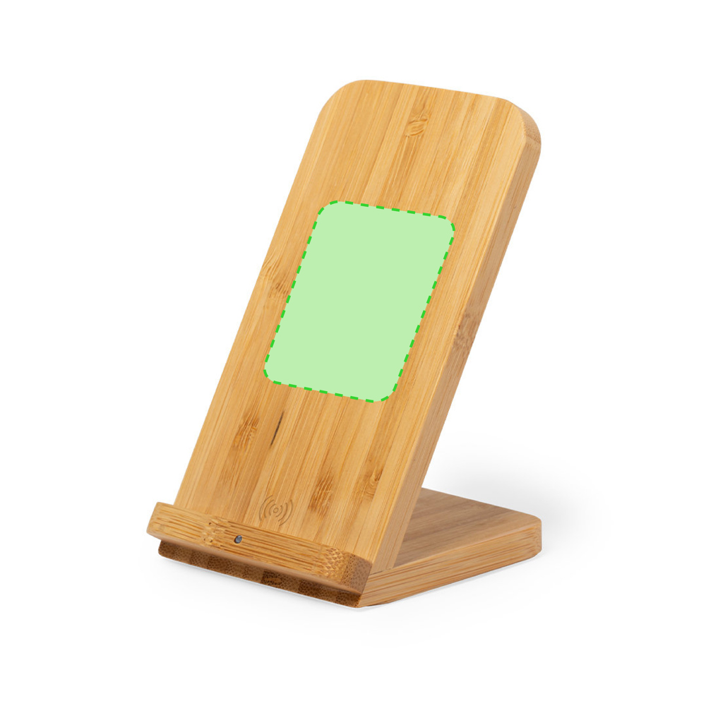 Naturlinie, kabelloses Ladegerät mit Smartphone-Halterungsfunktionalität. Hergestellt aus Bambus, aus natürlich geschnittenen Bambusstücken. Ladeanzeige und kompatibel mit Geräten, die mit drahtloser Ladetechnologie ausgestattet sind. Großer Druckbereich und präsentiert in einer attraktiven, individuellen Öko-Design-Box.